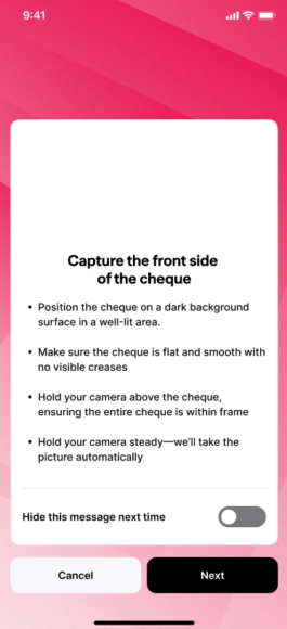 | Step 3: Capture the front side of the cheque based on instructions given. | ![]() |