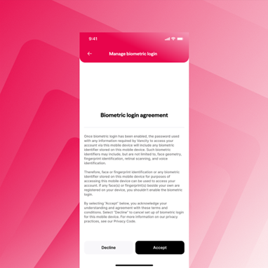 Review the Biometric login agreement and tap ‘Accept’. |