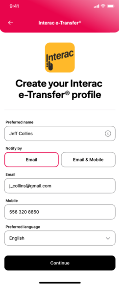 Select “Edit profile” and edit your Interac e-Transfer profile. Please note that the phone number entered must be a Canadian phone number. Both the sender and recipient must have Canadian Bank accounts at participating financial institutions for a successful e-Transfer. |