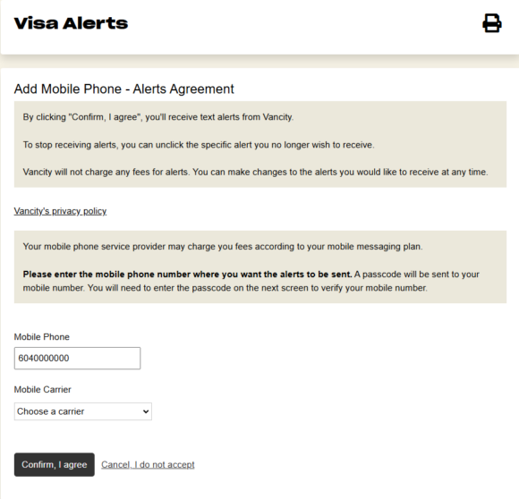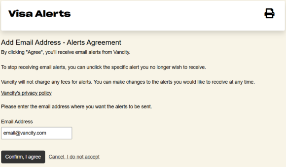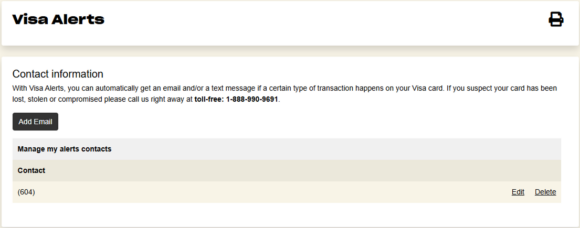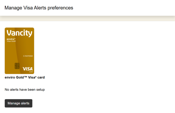 - If you are a primary cardholder (for personal use Visa* cards) and member of Vancity, additional alerts can notify you of transaction activities on your card. These can be set up by logging in to Online Banking: