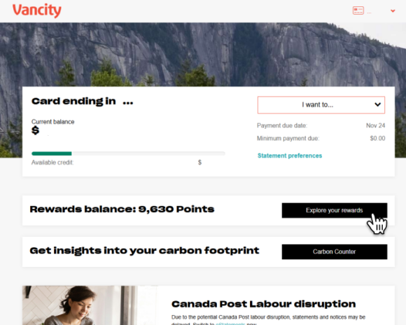 You can also view your rewards balance on your statement in the right-hand column under “Vancity Rewards”.