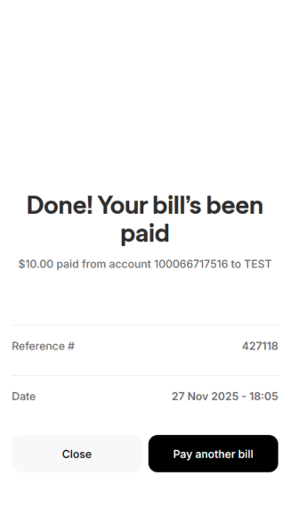 Choose the account to pay from, then confirm the payee, amount, and date. Tap ‘Continue’ when ready. |